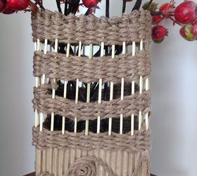 I continued weaving the twine over and under around the box to complete five rows. After that, I separated the weaving into five or more rows until nearing the top. Then I wrapped the twine around each wood skewer, all the way around, gluing the end piece twine down inside and cutting off the excess. I coated the entire vase with mod podge, and let dry for a few hours - you can skip this step and use craft varnish instead.