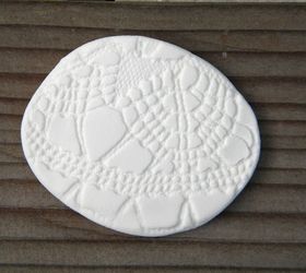 I tried out a clay recipe and ran into some problems. No worries - I patched them up and painted them. To make these clay medallions I rolled out the clay and used a cotton doily to make the impressions.