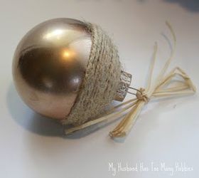 Cleaning out the attic, I stumbled across some old inexpensive glass ball Christmas ornaments left over from a previous project and an idea hit me on how I could use these left over ornaments for a Fall project.I gathered my stash of ornaments, a can of metallic copper spray paint, twine, raffia and my hot melt glue gun.