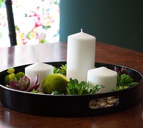 A $150 tray at Crate & Barrel inspired this DIY centerpiece - instead of going for an as-close-as-possible knockoff, I took inspiration from the styling in the catalog image and ran with it...I bought a plastic tray at the thrift store for $5 and spray painted it black.