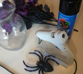While it's definitely still too early to decorate for Halloween, it's not too early to think about any projects you might want to make this year! Thinking a little bit ahead gives me plenty of time to get all the fun stuff made before it's time to actually put things up.Pinterest is abuzz with Halloween lately and this super easy vase has been pinned 5000 times in a month! You need a glass vase (I bought mine at the dollar store), hot glue, flat black spray paint and some fun creepy accessories. I bought purple and black Halloween flowers, spider, and "creepy cloth" from the dollar store.
