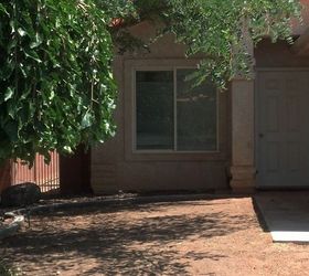 When we moved into our house 2 years ago it had been abandoned for 3 years. The front yard was nothing but dirt with an ugly cypress within sight line of the front door. Two trees on the side of the lot was the only bit of color the lot had. We now have a beautiful front yard..When we first moved here there wasn't anything in the front yard except dirt. There was a big elm tree and a weeping fig on the side of the lot but that was all. Near the end of the sidewalk was one huge ugly cypress that was in direct line with the front door. That was the first to go. then, since we live at the edge of the Mohave desert we didn't want to plant grass. Instead we just covered the main portion with gravel. It stayed that way for another year. And then we did this.