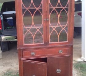 Bought this cabinet at a flea market for $95, with plans to paint & use for storage in my sewing room. Cost of paint & new hardware approximately $80.Removed door pulls & knobs & lightly sanded cabinet. Removed interior panels & glass.